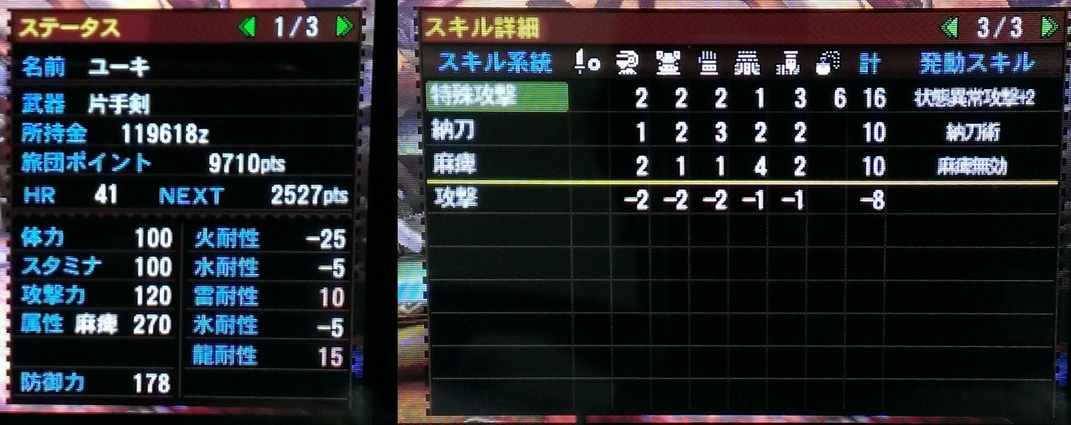 スキル 状態異常攻撃+2、納刀術、麻痺無効